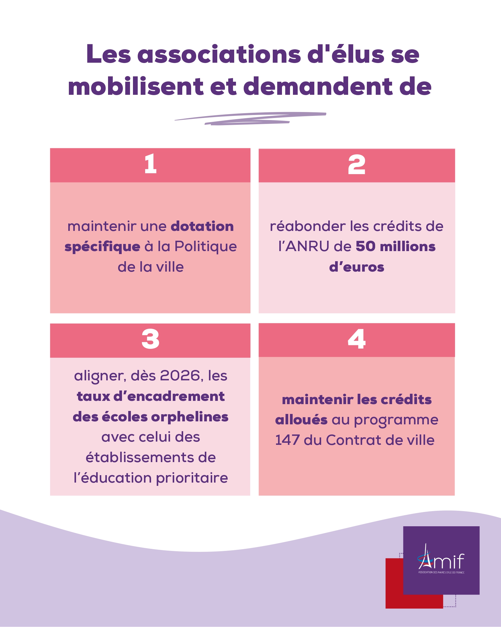 Nous appelons à préserver les moyens dédiés aux territoires les plus fragiles, garantir la lisibilité des financements et maintenir les dispositifs qui ont démontré leur utilité pour les quartiers prioritaires.