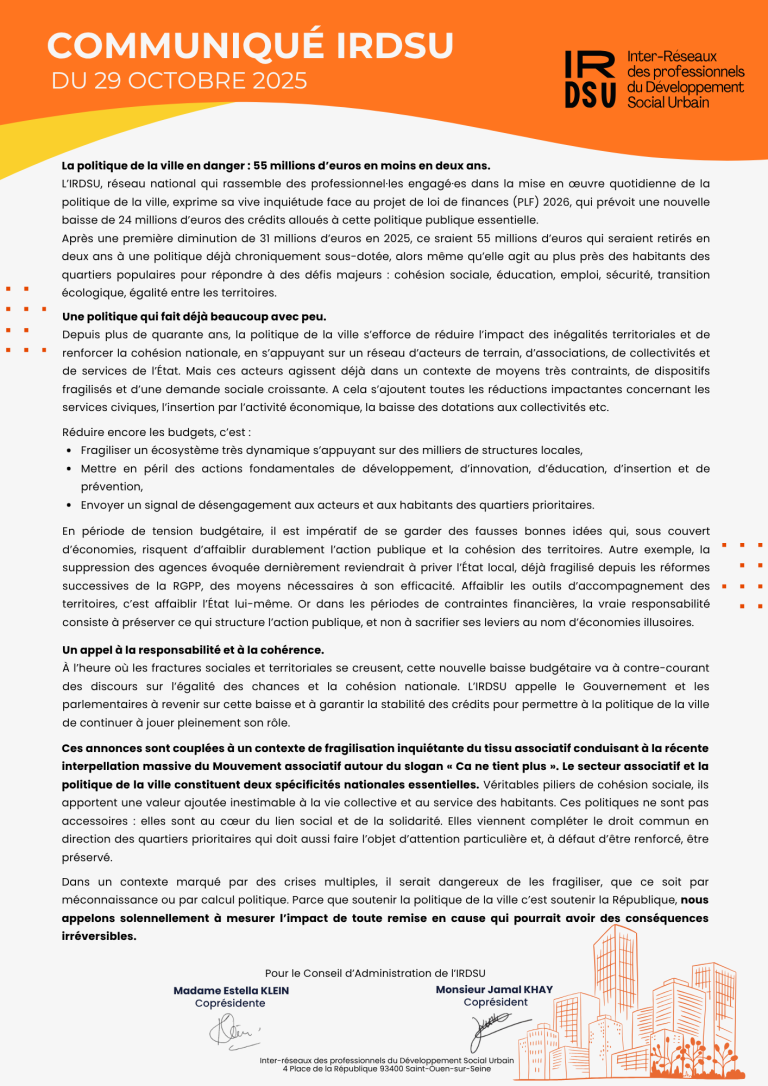 Communiqué IRDSU 29 octobre – 2025 Depuis plusieurs mois, nous constatons avec inquiétude un climat de fragilisation croissante des moyens alloués à la politique de la ville. Dans un contexte social et territorial marqué par de fortes tensions, les acteurs de terrain voient leurs marges de manœuvre se réduire, alors même que les […]
